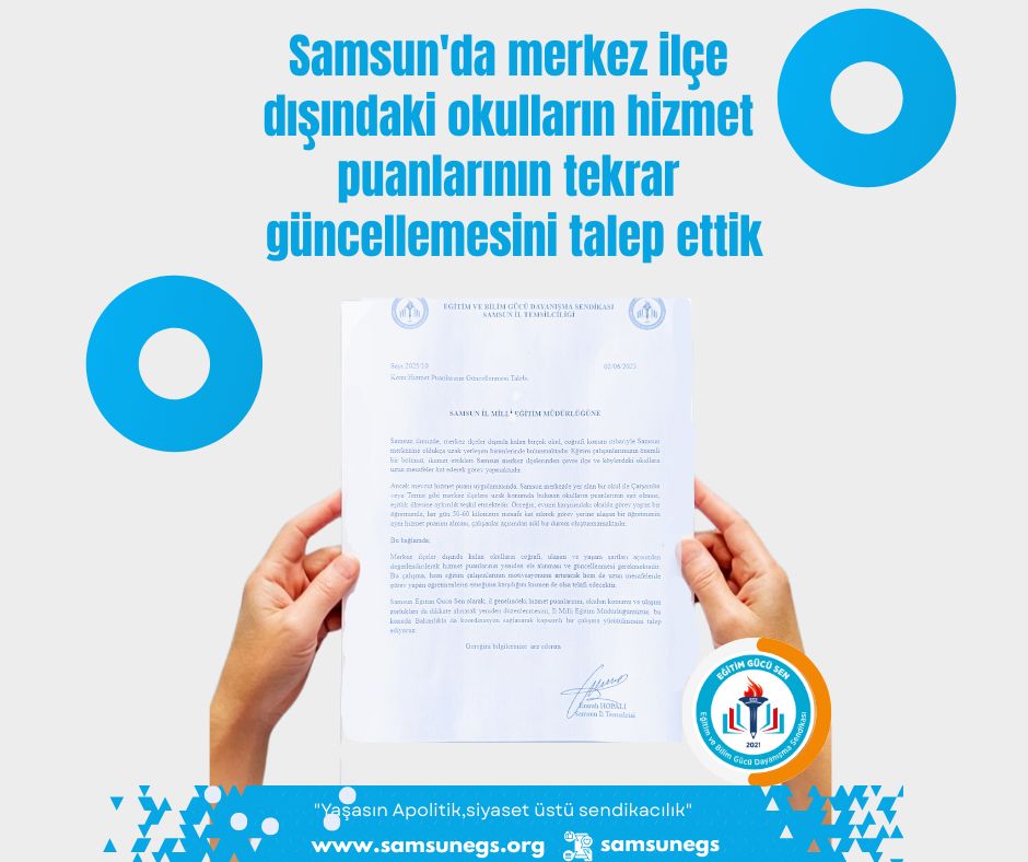 Samsun İl Milli Eğitim Müdürlüğü’ne çağrımızdır:Okulların hizmet puanları, merkeze uzaklık, ulaşım ve yaşam koşulları dikkate alınarak yeniden güncellenmelidir.